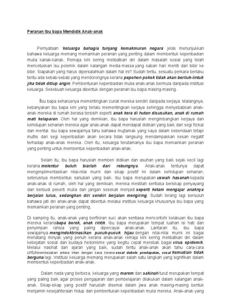 Hal ini berarti peranan orang tua dalam mendidik anak menurut alkitab harus diawali dengan rasa takut akan tuhan. Contoh karangan bahasa melayu (bm) : Kegagalan dalam mendidik anak dan menjadikan anda berada dalam kelompok ibubapa yang 'gagal' adalah perkara yang tidak diinginkan oleh semua ibubapa. Jika anda keliru tentang tanggungjawab sebagai ibu ayah, ini melahirkan anak adalah satu permulaan kepada perjalanan hidup si kecil yang panjang. Mereka tidak sedar bahawa nilai kebendaan.