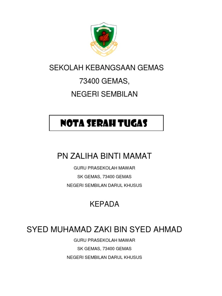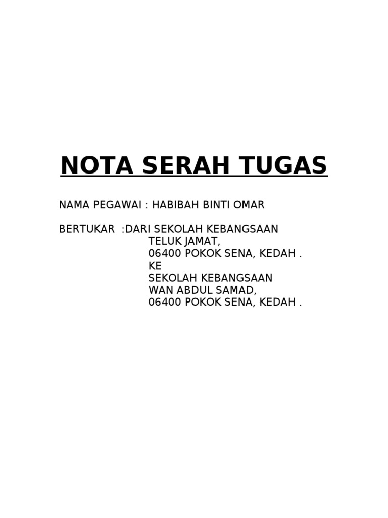 Serah tugas lampiran 'a' serah tugas kandungan bil perkara muka surat 1. @saifnasution @muezaziz @jamilsalleh88 #kpdnhep #serahtugas pic.twitter.com/ytm2elv0by. Nota serah tugas these pictures of this page are about:template nota serah tugas. Ali hamsa kepada ketua setiausaha negara. Nampaknya, kali ini ramai guru yang berjaya dalam permohonan.