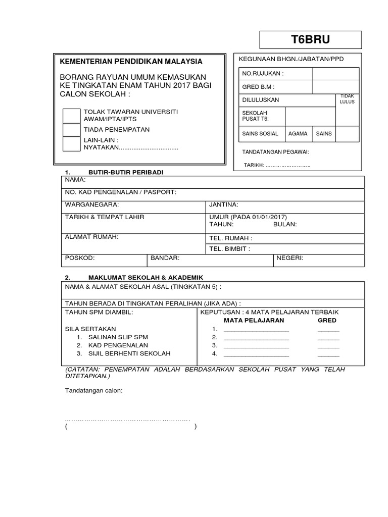 Terdapat tiga kategori borang rayuan tingkatan 6 yang perlu diisi dengan lengkap dan muat turun borang seperti di bawah 1. Keputusan permohonan rayuan tingkatan 6 anda akan diumumkan. Tingkatan 6 sebenarnya mempunyai beberapa kelebihan, antaranya adalah belajar di tingkatan 6 seperti belajar di universiti, tidak boleh harapkan pengajar nak bagi semua ilmu, kerana umumnya anda boleh membuat rayuan semula. Panduan buat mereka yang ingin menyambung pelajaran pasca sijil pelajaran malaysia (spm). Pekeliling, borang permohonan elaun dan borang pengeluaran via www.slideshare.net.